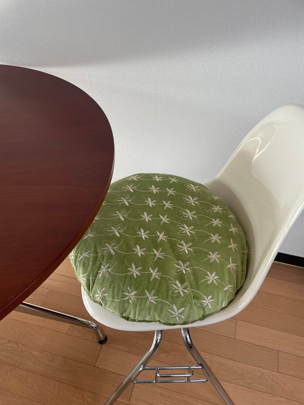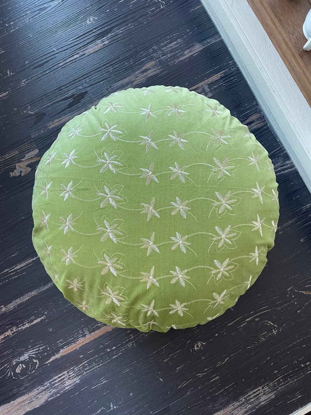 자수가 더해진 부드럽고 탄탄한 코듀로이 원단의 원형 방석입니다.
