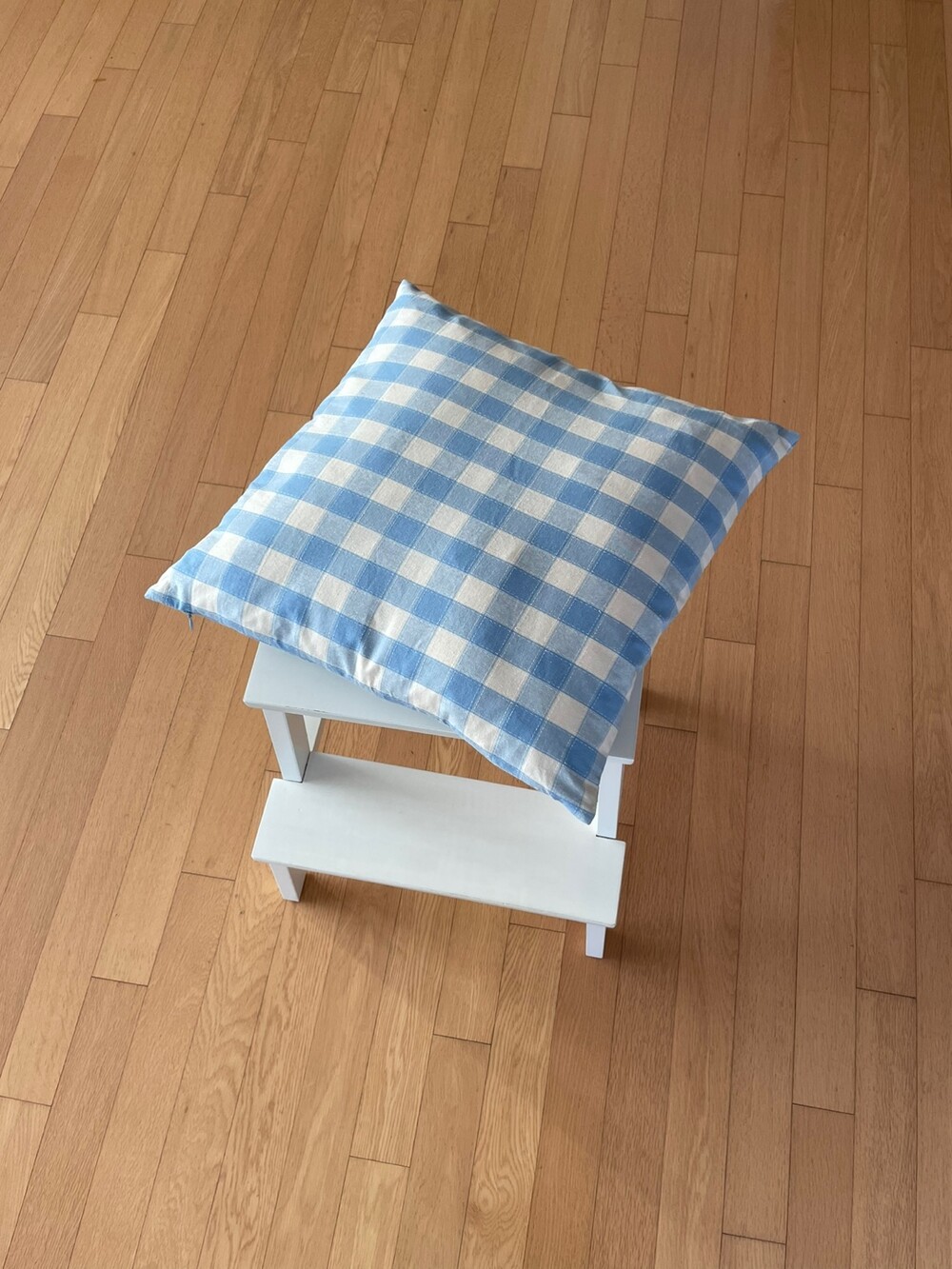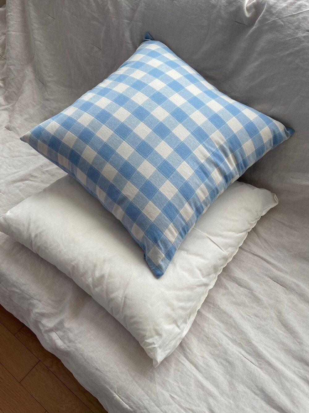 포인트로 얇은 스티치가 더해진 깅엄 쿠션 커버입니다.
